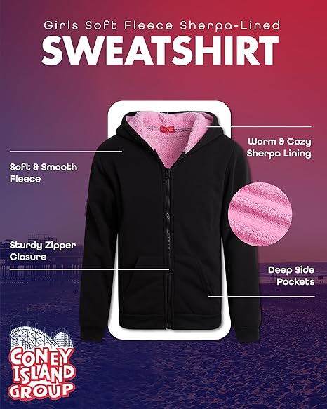 Coney Island Girls Hoodie – Cozy Soft Fleece Sherpa Lined Zip Up Hoodie Sweatshirt for Girls (Sizes Run Small: 4-16)