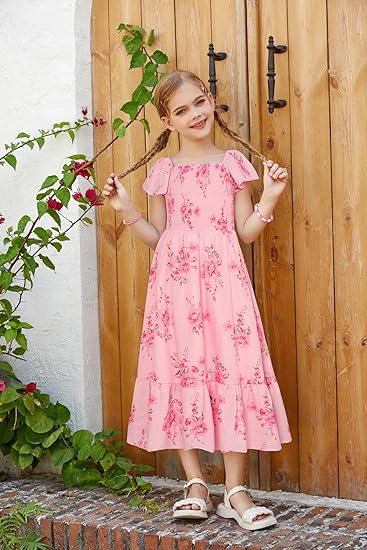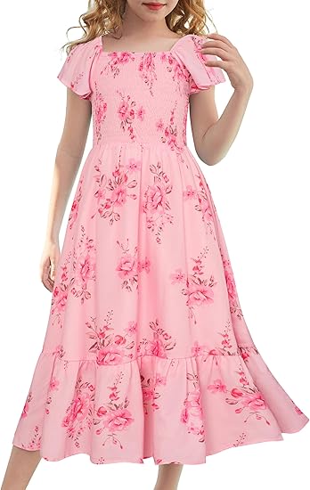 GRACE KARIN Girls Floral Dress Flutter Sleeve Square Neck Tiered Midi Dress Smocked Flared A-line Dress 5-14Y